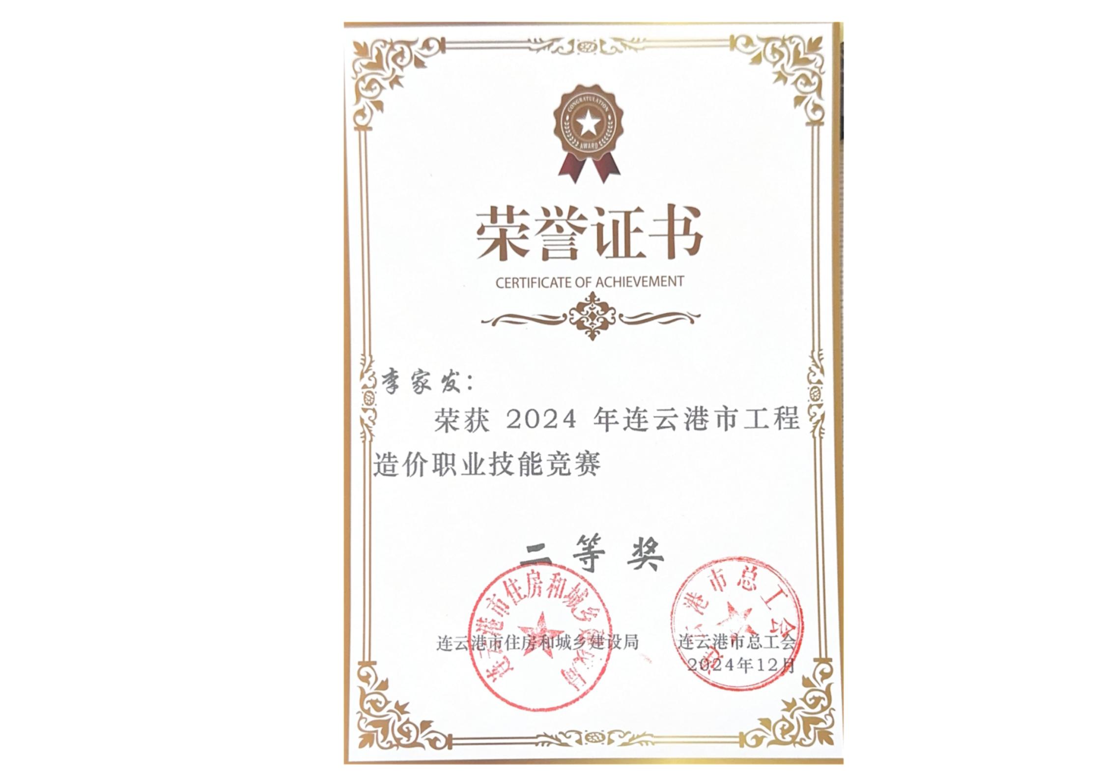 2024年李家发连云港市工程造价职业技能竞赛二等奖