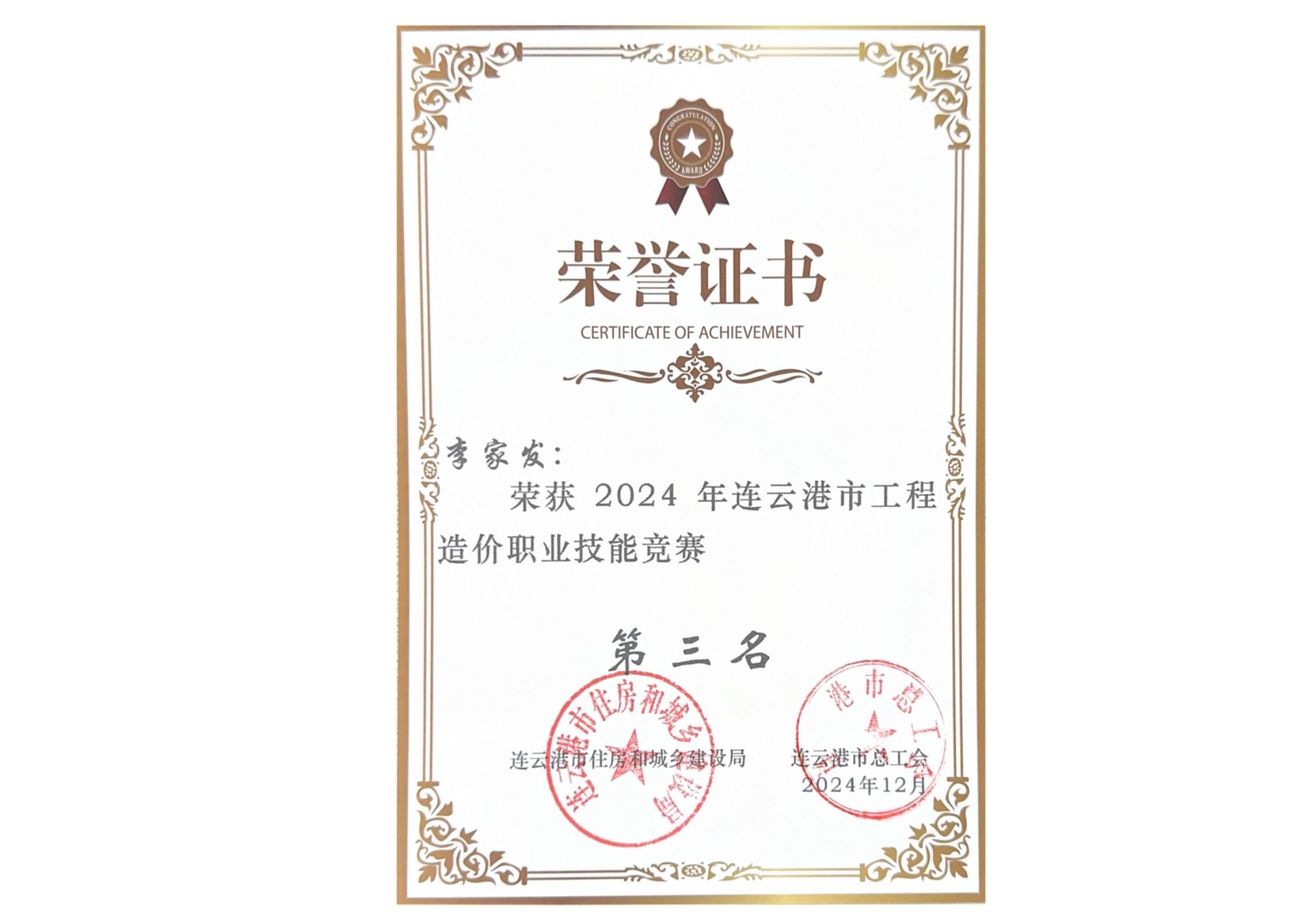 2024年李家发连云港市工程造价职业技能竞赛第三名