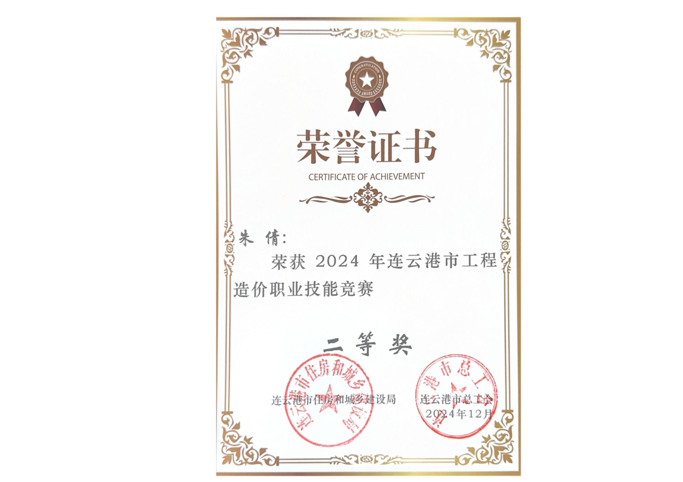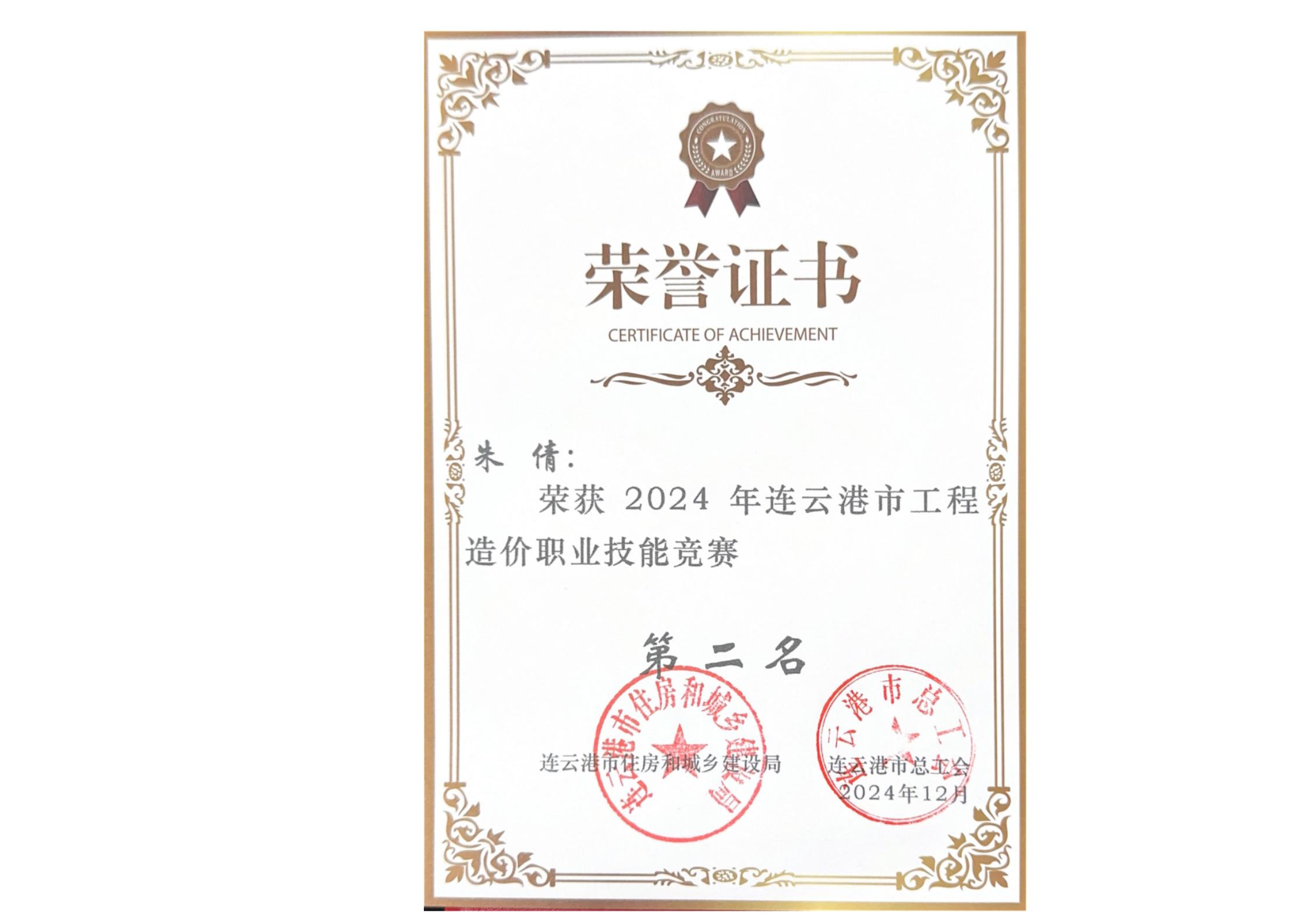 2024年朱倩连云港市工程造价职业技能竞赛第二名