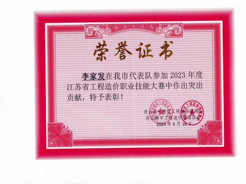 2023年度江苏省工程造价职业技能大赛受到个人表彰-李家发
