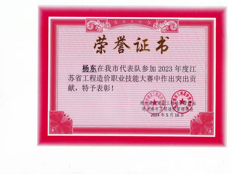 2023年度江苏省工程造价职业技能大赛受到个人表彰-杨东